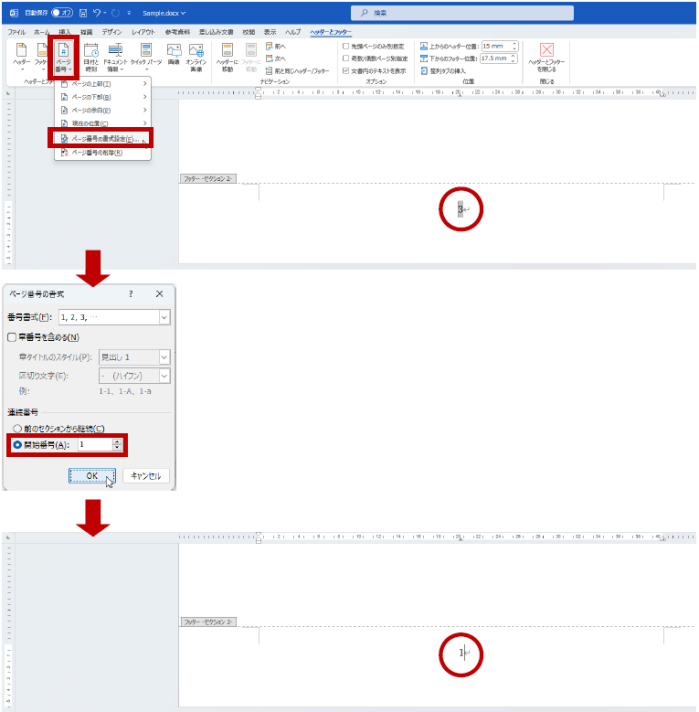 これを「1」から開始したい場合は、フッターを編集モードにしてページ番号の位置にカーソルをおいて、リボンの [ヘッダーとフッター] タブの [ヘッダーとフッター] グループの [ページ番号の書式設定] をクリックし、[ページ番号の書式設定] ダイアログ ボックスの [連続番号] で ([前のセクションから継続] ではなく) [開始番号] を選択して「1」を指定します。