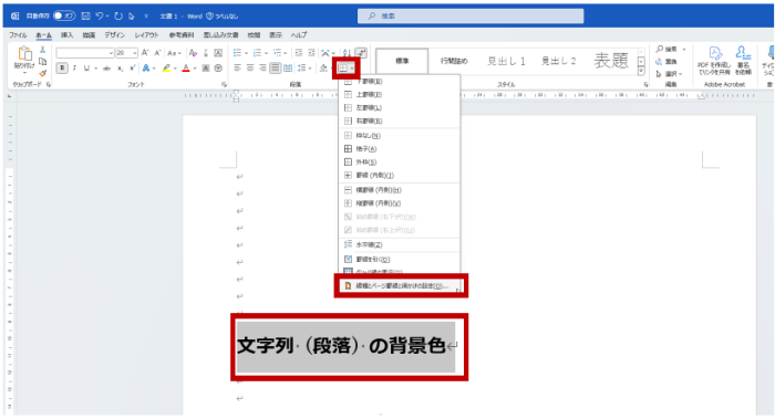- 網かけ (背景色) を設定する段落を選択して、リボンの [ホーム] タブの [段落] グループの罫線ボタンをクリックして、[線種とページ罫線と網かけの設定] をクリックします。