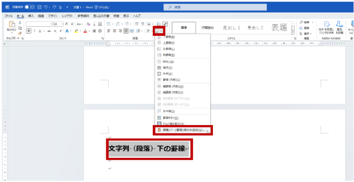 - 罫線を設定する段落を選択して、リボンの [ホーム] タブの [段落] グループの罫線ボタンをクリックして、[線種とページ罫線と網かけの設定] をクリックします。
