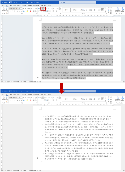 段落の間隔を追加した 5 つの段落を選択して、リボンの [ホーム] タブの [段落] グループなどから、[箇条書き] (記号が段落の先頭に追加される) や [段落番号] (① や 1. などの番号が段落の先頭に追加される) を設定すると、前の手順で設定した段落の間隔がなくなってしまいます。これはなぜ?という質問でした。