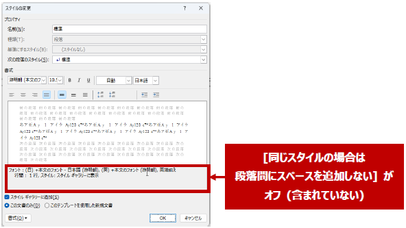 ということは、[同じスタイルの場合は段落間にスペースを追加しない] をオフにすれば、段落の隙間は設定した通りに表示される、ということです。