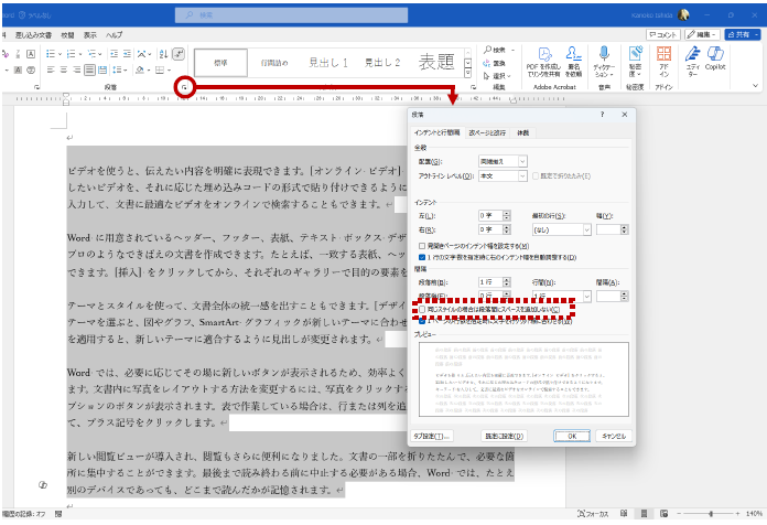 結論、設定したはずの段落の間隔がなくなった!と思ったら、スタイルがどうのこうのがよくわからなくても、[段落] ダイアログ ボックスの [同じスタイルの場合は段落間にスペースを追加しない] を確認してください。