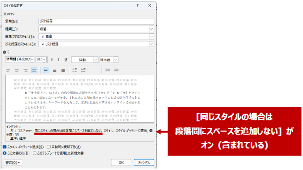 [リスト段落] スタイルでは、[同じスタイルの場合は段落間にスペースを追加しない] という設定がオンになっているため、同じスタイルが連続したときに段落間のスペース = 段落前や段落後の間隔がなくなります。