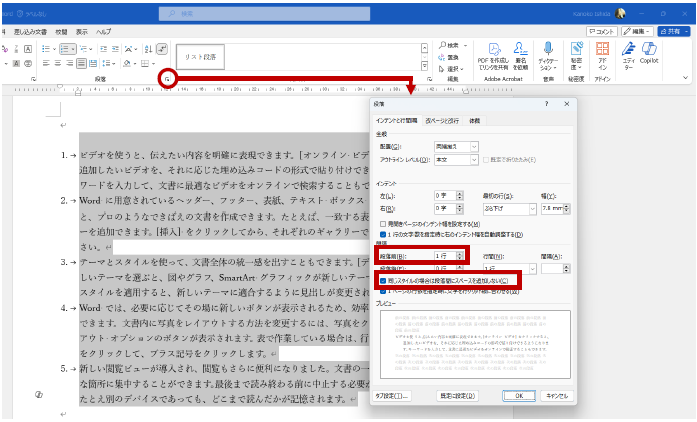 [段落番号] を設定して [リスト段落] スタイルが適用された 5 つの段落を選択して [段落] ダイアログ ボックスを表示すると、[同じスタイルの場合は段落間にスペースを追加しない] がオンになっていることが確認できます。