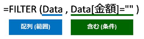 下図の左端にあるテーブルには「Data」という名前がついています。この [Data] テーブルの [金額] 列が空白のレコード (行) を抽出しているのがこちらの数式です。