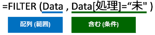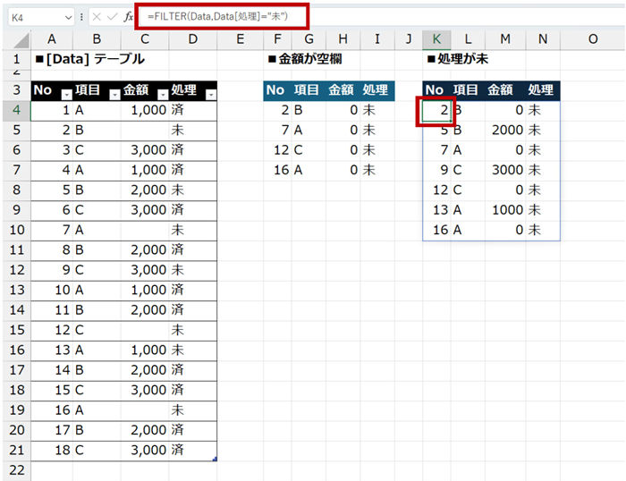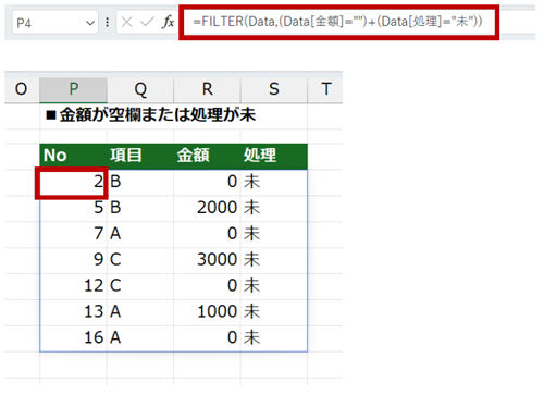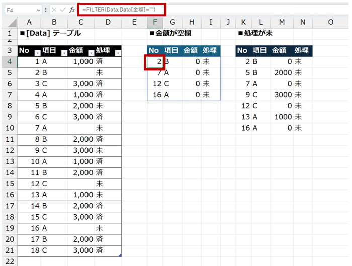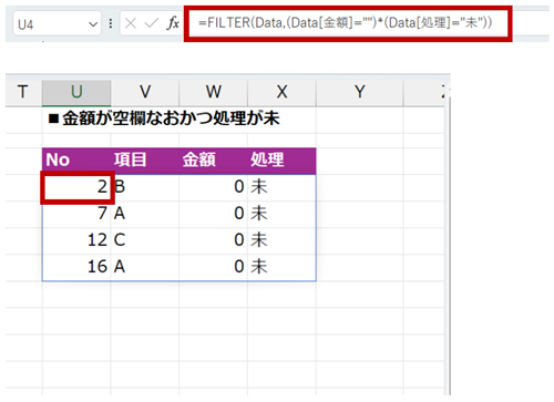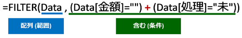 [Data] テーブルの [金額] 列が空白、または [処理] 列が「未」のレコード (行) を抽出しているのはこちら。
