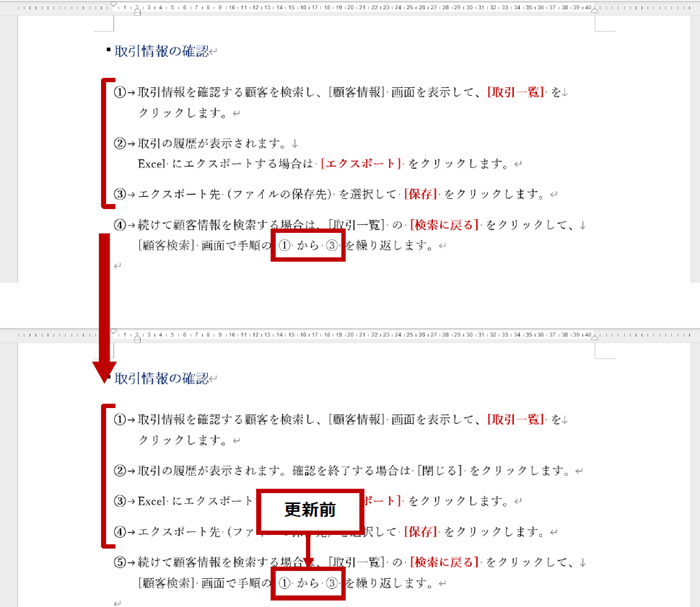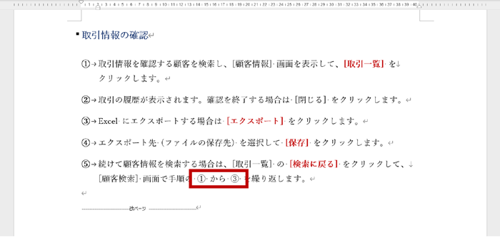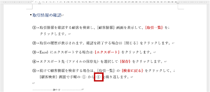 たとえば下図の文書では、「① から ③ を繰り返します。」と記述されていますが、この「①」や「③」は手入力しているのではなく、相互参照という機能を使って表示しています。そのため、手順が増えて参照すべき番号が変わっても入力しなおす必要はありません。