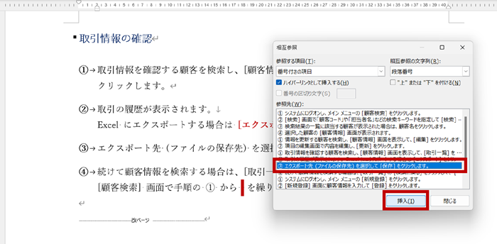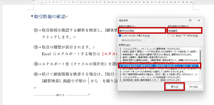 3.カーソルの位置に選択した参照先の段落番号が挿入されます。(もう 1 つ挿入するのならダイアログ ボックスは開いたままで OK)