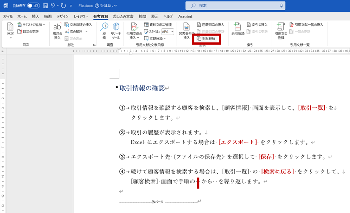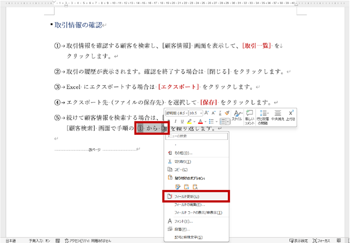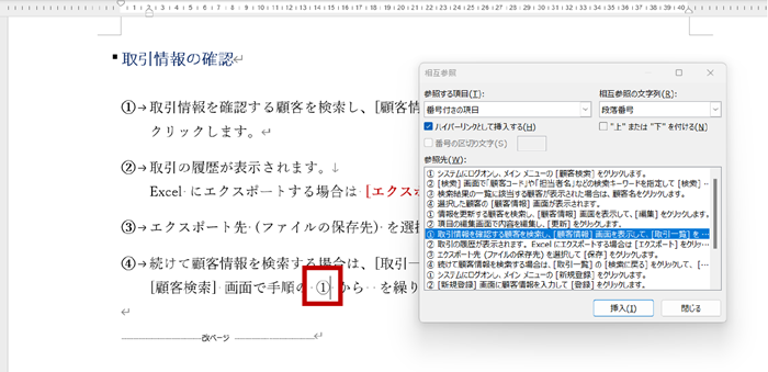 丸数字などの番号を手入力した文字列にするのではなく、きちんと段落番号という書式で設定することによって相互参照で参照することができ、参照している情報はフィールドを更新することで最新の状態を保つことができます。