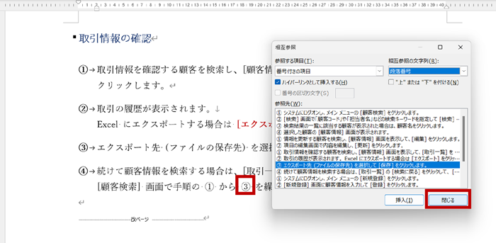 4.同じように挿入したい段落番号がもう 1 つあるのなら、参照した情報 (③ など) を挿入する位置にカーソルをおいて、[参照先] で該当の位置を選択して [挿入] をクリックします。(ダイアログ ボックスは毎回閉じなくてもよい)