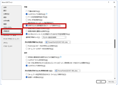 また、[Word のオプション] の [詳細設定] の [印刷するときに変更履歴を含むフィールドを更新する] がオンになっていると、印刷や印刷プレビューを実行したときに自動的に更新されます。