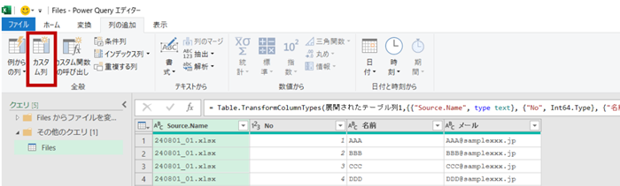 1. Power Query エディターの [列の追加] タブの [全般] タブの [カスタム] 列をクリックします。