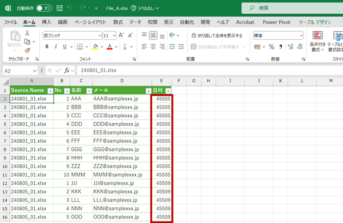 ただ、こちらをワークシートに読み込むとシリアル値で表示されます。セルの書式設定で日付の表示形式を変えればよいでしょう。ワ ークシートに読み込む前にきちんと日付データとしたいのなら次の手順に記載している数式で対応してください。