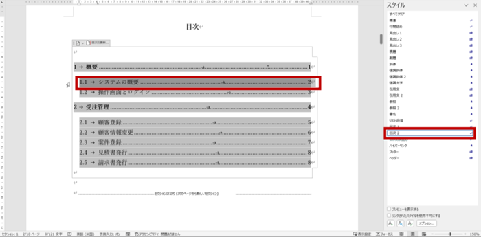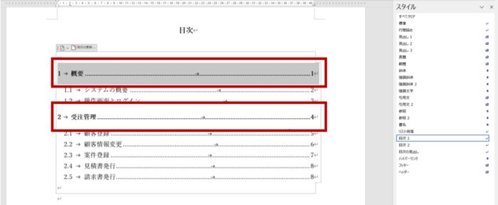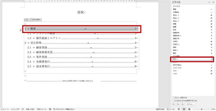 2.書式を変更したい目次レベルの段落を選択すると、使用しているスタイルが強調表示されます。