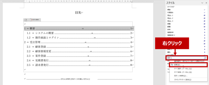 3. [スタイル] ウィンドウで、強調表示されている目次スタイル (目次 1) を右クリックして [変更] をクリックします。