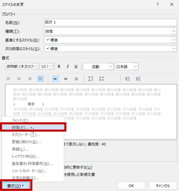 ここでは、段落前の間隔を追加するため、[書式] をクリックして [段落] をクリックしています。 フォントサイズやフォントの色など、ほかの書式を変更したい場合はその書式を設定してください。