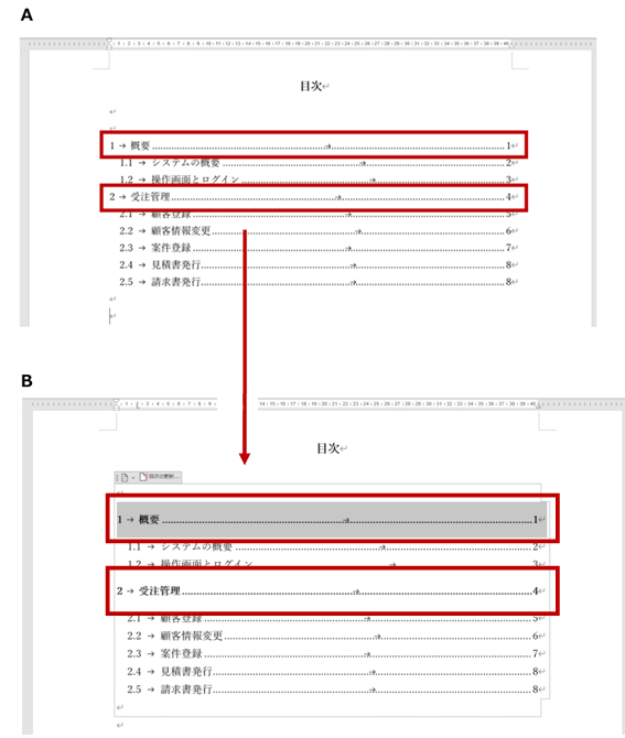 たとえば下図の A を B のように、一番上位レベルの目次の書式を変更 (段落前の間隔追加、太字設定) してみます。