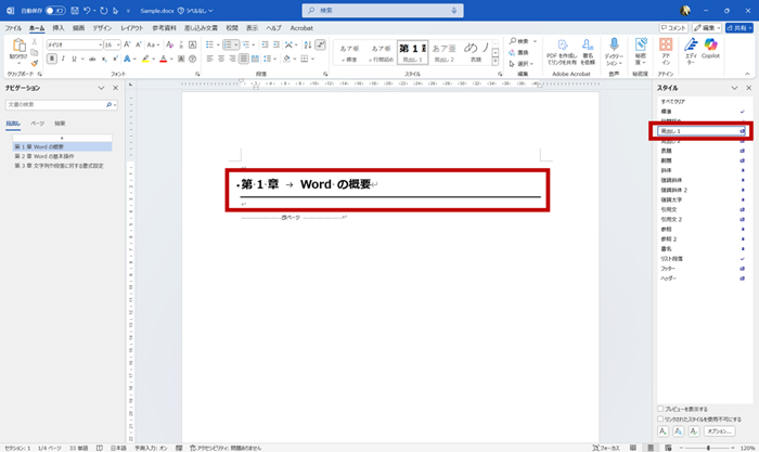 ここでは、[見出し 1] スタイルを使って章のタイトルを作ってあって、「第 1 章」などの番号の部分はアウトライン番号と組み合わせて設定しています。