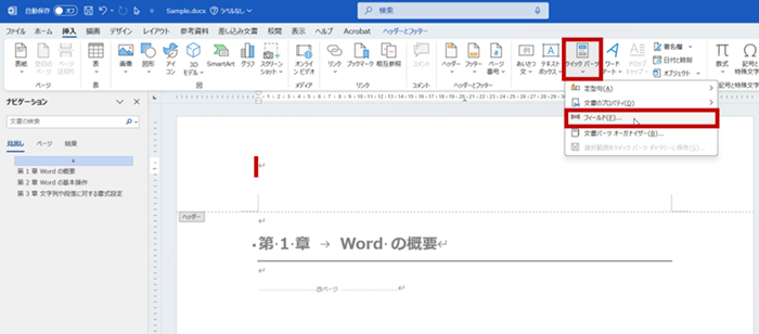 5. ヘッダーの章のタイトル文字列部分を挿入する位置にカーソルを置いて、再度 リボンの [挿入] タブの [テキスト] グループの [クイック パーツ] をクリックして [フィールド] をクリックします。