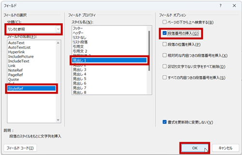 [分類] で [リンクと参照] を選択し [StyleRef] を選択して [スタイル名] で [見出し 1] を選んで [段落番号の挿入] をオンにして [OK] をクリックします。