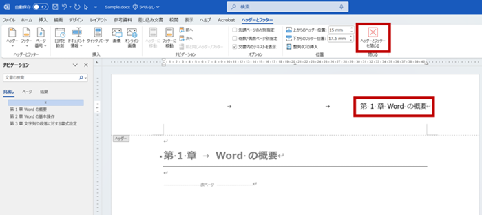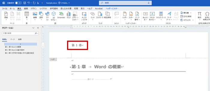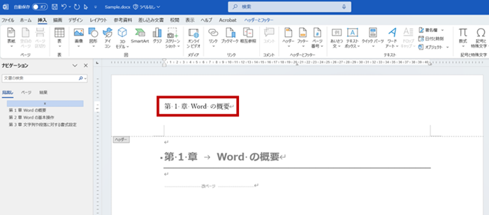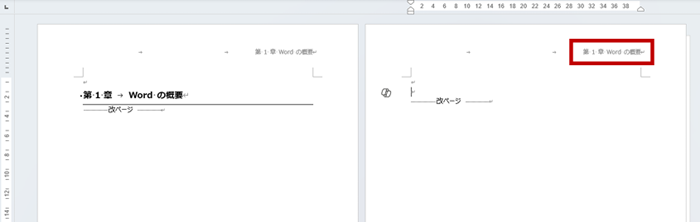 7. ヘッダーに章のタイトルの文字列の部分が挿入されます。