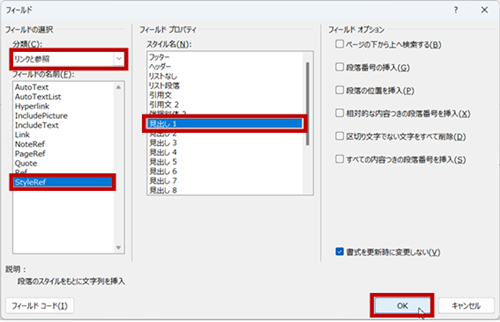 [分類] で [リンクと参照] を選択し [StyleRef] を選択して [スタイル名] で [見出し 1] を選んで [OK] をクリックします。