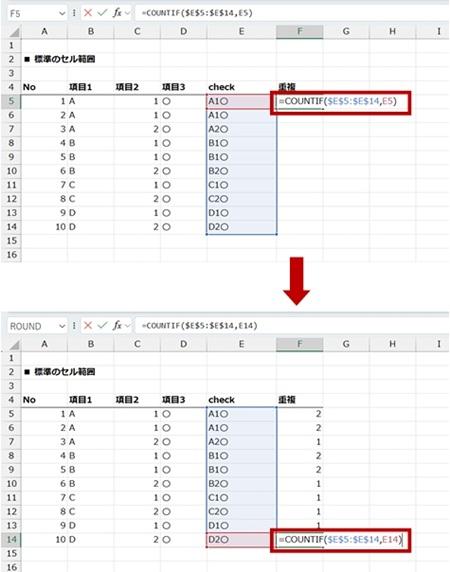 編集後 =COUNTIF($E$5:$E$14 , $E5)>1
