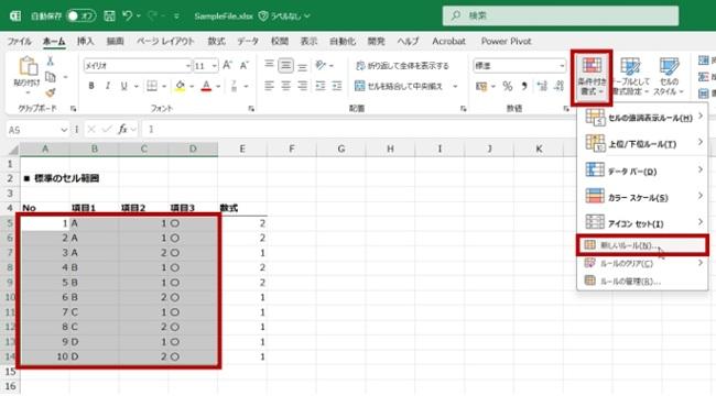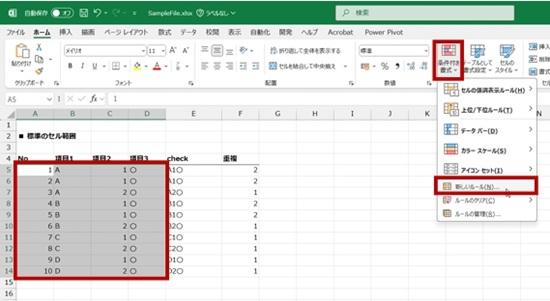 4. セル範囲の条件付書式を設定したい範囲を選択して、リボンの [ホーム] タブの [スタイル] グループの [条件付き書式] をクリックして [新しいルール] をクリックします。