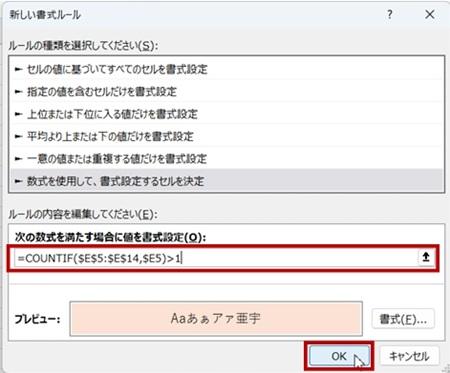 検索条件となるセル (E5) は列を固定した複合参照とし、COUNTIF の結果が 1 より大きい (2 以上) の場合に条件付き書式を設定したいので末尾に「>1」を追加しています。