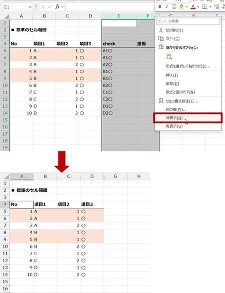 7. [check] 列と [重複] 列は条件付き書式のルールを作成するときに使用しているので削除できません。列を非表示に設定します。(私はこれでも十分だと思うけれど、非表示が嫌なのであれば後半に記載している方法でどうぞ。)