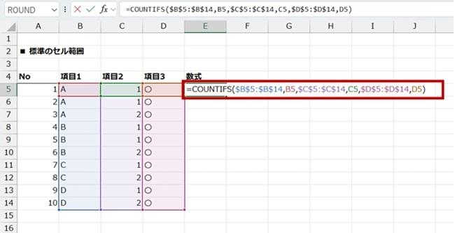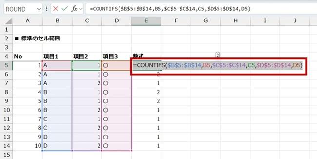セル E5 の数式 =COUNTIFS($B$5:$B$14 , B5 , $C$5:$C$14 , C5 , $D$5:$D$14 , D5)