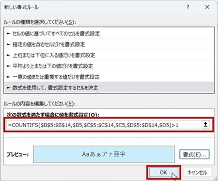 COUNTIF 関数の条件となるセルは列番号を固定した複合参照とし、COUNTIF の結果が 1 より大きい (2 以上) の場合に条件付き書式を設定したいので、末尾に「>1」を追加しています。
