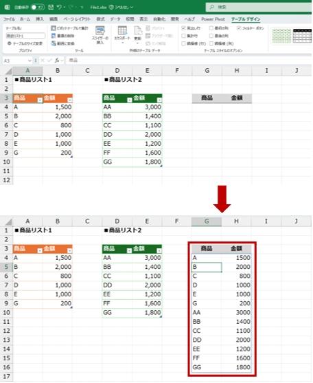 下図の [商品リスト1] テーブル (オレンジ) と [商品リスト2] テーブル (緑) のデータを 1 つの表にまとめます。 もちろん商品リストは 3 つでもよいですがここでは 2 つでやります。