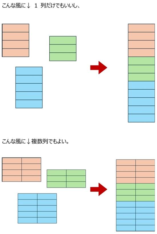 VSTACK 関数は、ヘルプによると「配列を垂直方向に順番に追加して、より大きな配列を返します。」とのこと。 縦方向に並んでいる範囲が 2 つあるとき、1 つ目の範囲の下に 2 つ目以降の範囲をくっつけて縦長にした結果を返してくれる、ということですね。