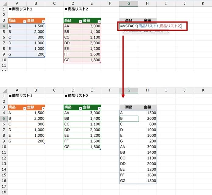 =VSTACK(商品リスト1 , 商品リスト2)