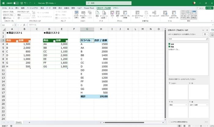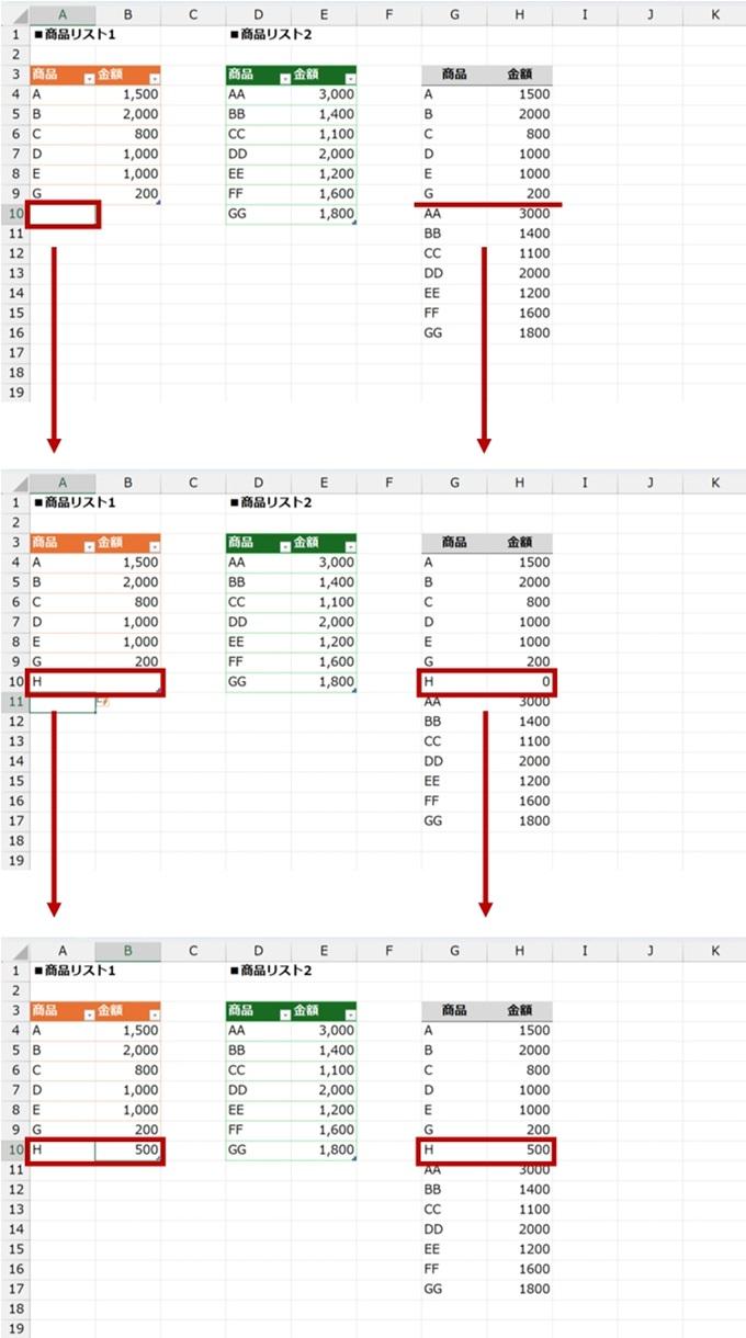 - ここでは 2 つのテーブル (商品リスト1、商品リスト2) を使うけれど、テーブルではないセル範囲を指定することもできます。