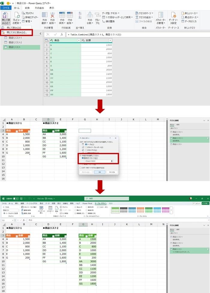 テーブルの結合なら Power Query でもよいのでは?と。それはそうです。 手順は省くけれど、下図では [商品リスト1] と [商品リスト 2] を [接続の作成のみ] で作成して、クエリの追加で 1 つにまとめて [商品リスト] クエリを作り、ワークシートに読み込もうとしています。