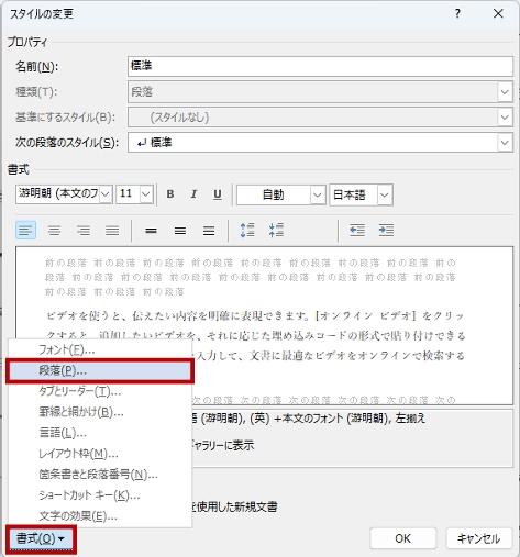 2. [スタイルの変更] ダイアログ ボックスの [書式] をクリックし、[段落] をクリックします。