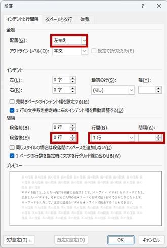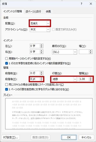 3. [段落] ダイアログ ボックスが表示されます。下図の赤枠の部分が従来と変わっていて、特に [行間] の「倍数 1.08」と [段落後] の「8 pt」が広さに影響がでている部分です。