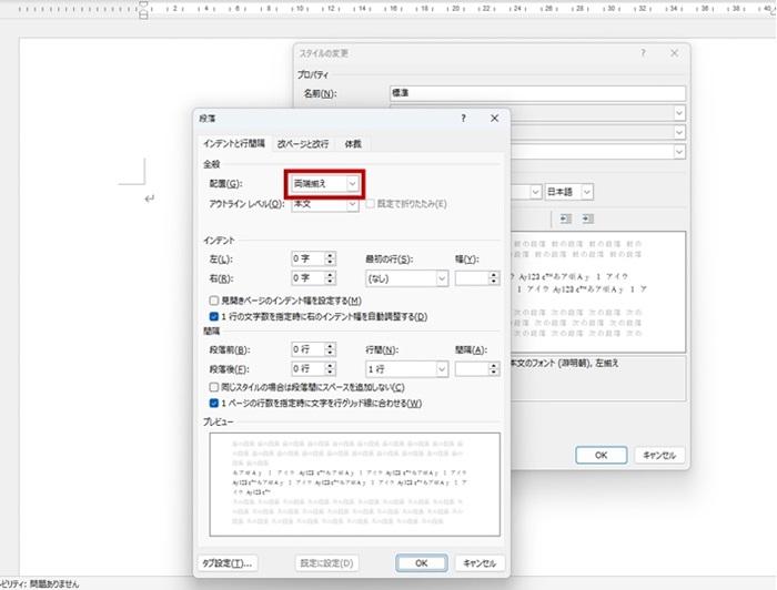 [標準] スタイルの [スタイルの変更] ダイアログ ボックスを開き、[書式] → [段落] をクリックして [段落] ダイアログ ボックスを開いて [配置] で「両端揃え」を選択するなど、新規文書に適用したい書式を設定 / 変更します。