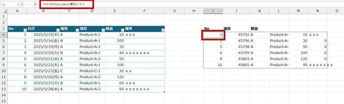 =FILTER(Data , Data[種別]="A")