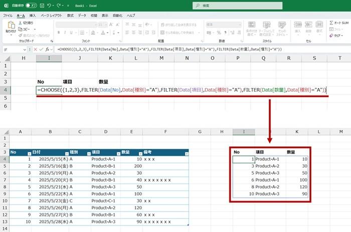 (ここでは) 3 つに分けて抽出した内容を CHOOSE 関数で最後にまとめている、というイメージでしょうか。 この場合、CHOOSE 関数の第 2 引数以降に指定する FILTER 関数の条件 (Data[種別]="A") について、同じ内容を何度も指定しなければならないので冗長だな、と感じるかもしれません。少しでもシンプルに条件の指定を行いたい場合は LET 関数を活用するとよいでしょう。それはまた別途書きます。