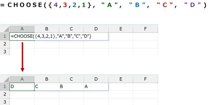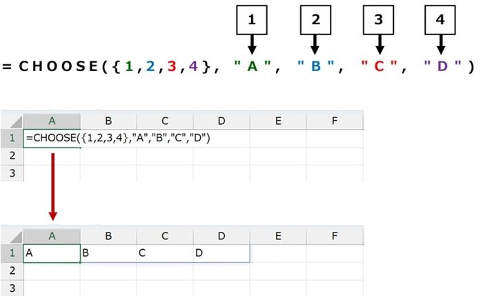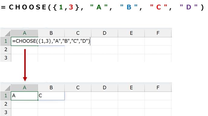 たとえば下記の数式では、第 2 引数以降の値を、第 1 引数 (インデックス) の配列定数で指定した順序で横に並べた結果を返します。
