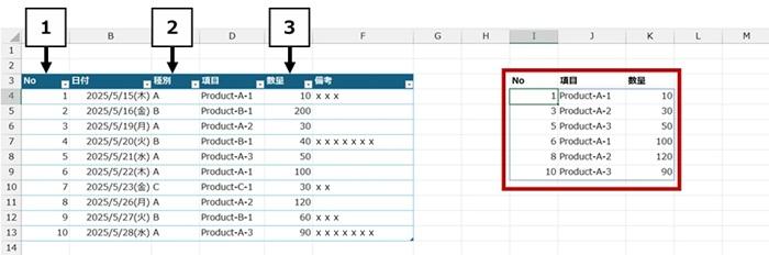下図のようにテーブルの中の一部の列 ([No]、[項目]、[数量]) だけを抽出結果として返したい場合どうするか、について書きます。