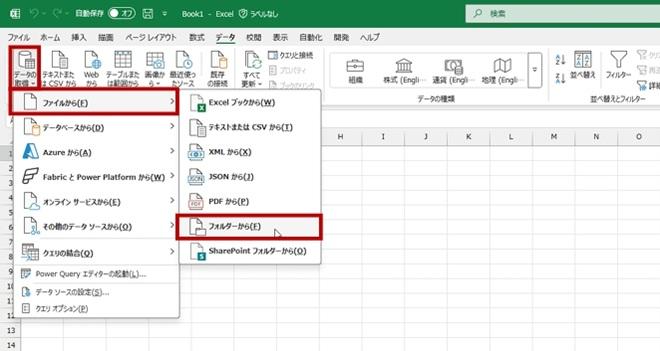 1. リボンの [データ] タブの [データの取得と変換] グループの [データの取得] をクリックし、[ファイルから] - [フォルダーから] をクリックします。
