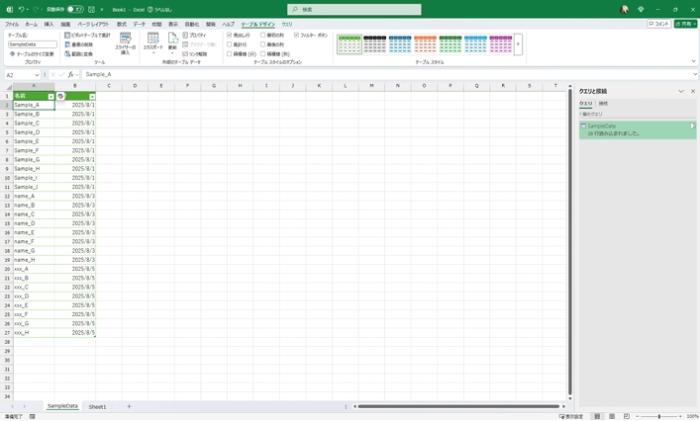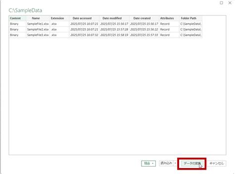 ここでは、C ドライブにある [SampleData] というフォルダーに、現在 3 つの Excel ブックが含まれていて、それぞれのブックには列構造は同じだけれど名前の違うテーブルがあります。このテーブルを結合して 1 つのテーブルとします。