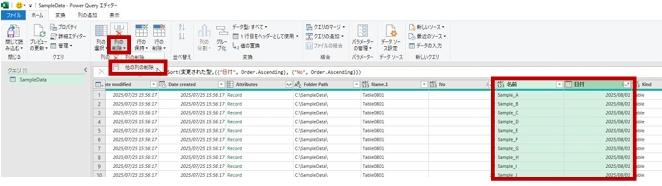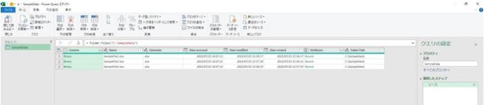 4. Power Query エディターが起動し、指定したフォルダー内のコンテンツが一覧で表示されます。