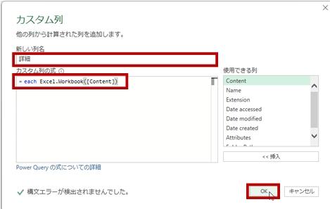 6. [新しい列名] に作成する列の名前を入力し、[カスタム列の式] に「= each Excel.Workbook([Content])」と指定して [OK] をクリックします。