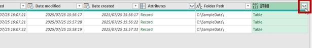 7. 列が作成され、ファイルの中にあるシートやテーブルの一覧が含まれる Table が表示されます。 列名のところに表示されている展開ボタンをクリックします。