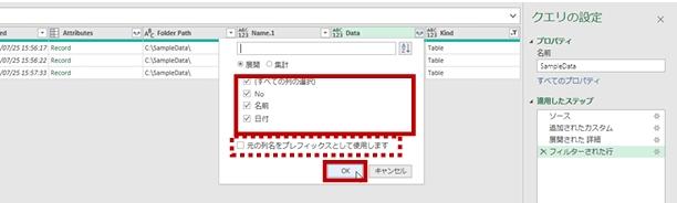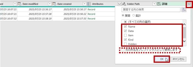 8. [Name]、[Data]、[Kind] のチェックをオンにして、[元の列名をプレフィックスとして使用します] をオフにして [OK] をクリックします。
